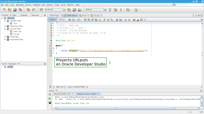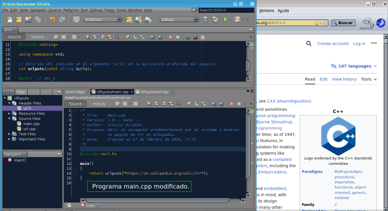 Una vez terminado de escribir en los tres ficheros presione las teclas Shift+F11 para construir el programa ejecutable 'urlputs' luego y si todo ha salido bien presione la tecla F6 para ejecutarlo. Puede modificar en main.cpp para que abra la página de C++ en Wikipedia. Escriba la url "https://en.wikipedia.org/wiki/C++" en la línea 14, ver siguiente imágen: