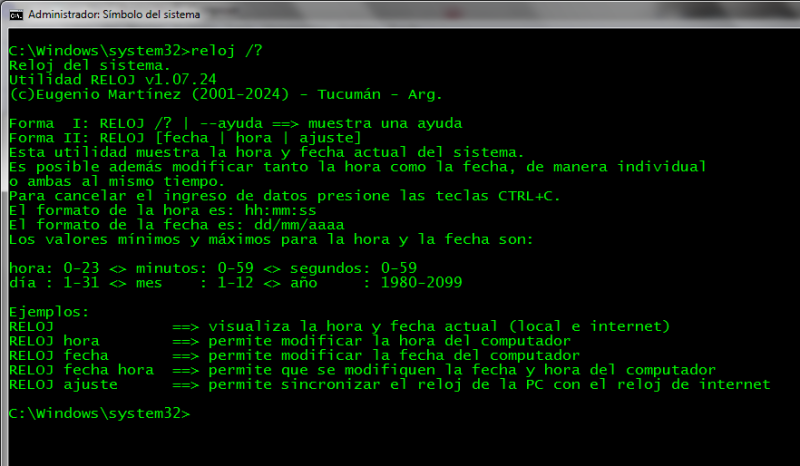 Propósito: muestra, modifica o ajusta la hora y la fecha del sistema local. Está pensado para utilizarlo en MS-DOS/Windows consola 16/32/64 bits y GNU Linux.