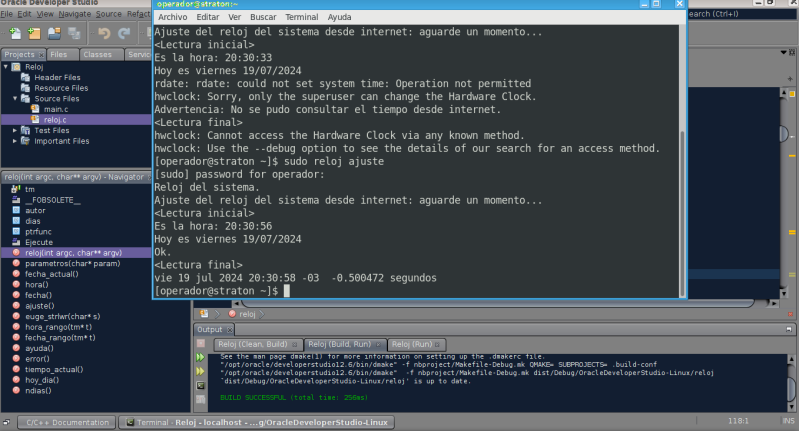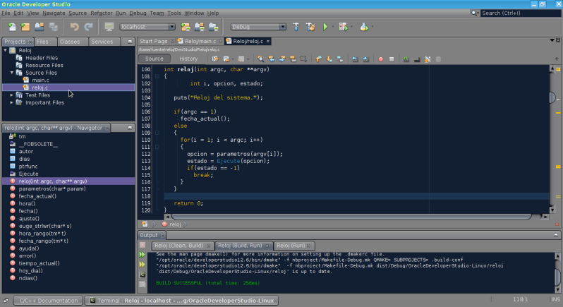 Imágen 6: vista del IDE Oracle Developer Studio 12.6 con el código fuente reloj.c